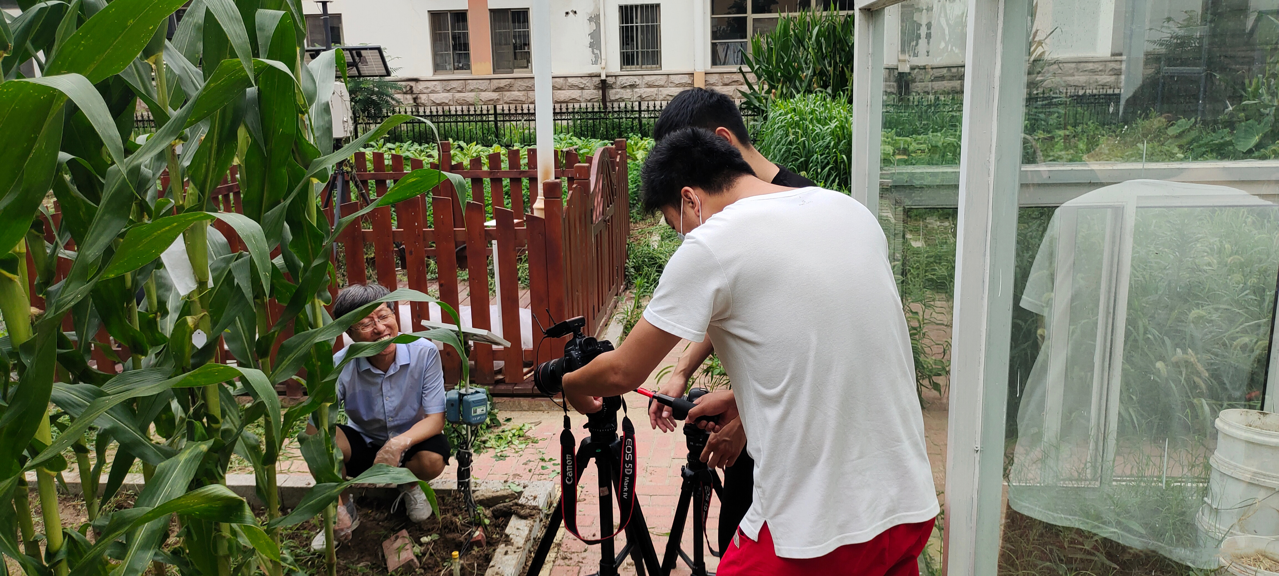 7月11日,beat365中文唯一官网教授杨锦忠在作物认知园进行玉米花粒期栽培实验视频拍摄工作。拍摄前,他根据场景需要,选择有代表性的玉米植株,与导演和摄影师交流成片的要求,确定分镜机位,为了达到理想的效果往往需要重复拍摄几次。尽管天气炎热,杨锦忠还是坚持拍摄完了玉米花粒期田间素材。暑假期间,项目团队各位专业教师克服疫情困难,冒酷暑抢农时,如期开展水稻、玉米、大豆等作物的实验课视频录制。