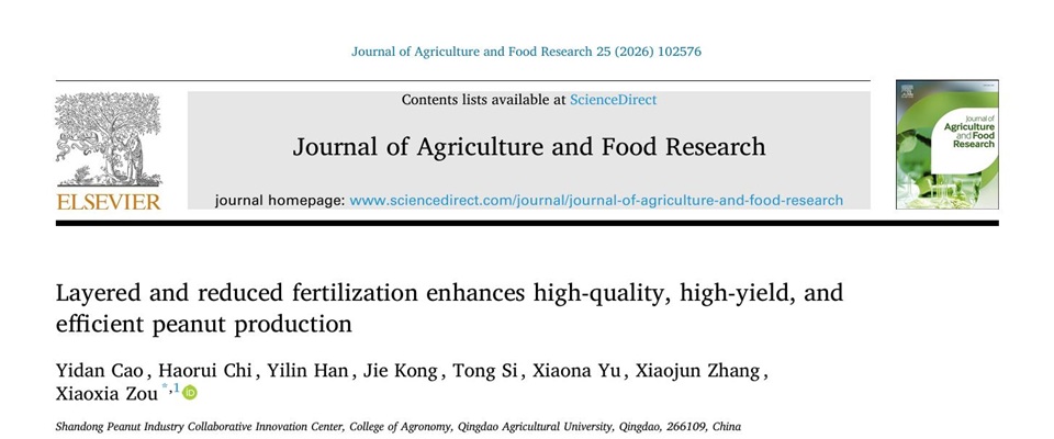 近日,beat365中文唯一官网花生研究中心团队在分层施肥提高花生产量和品质机理研究中取得新进展,相关研究成果发表在Journal of Agriculture and Food Research(中国科学院2区TOP期刊,IF:6.2)。该论文第一通讯单位为beat365中文唯一官网,beat365中文唯一官网博士研究生曹议丹为第一作者,国家花生产业技术体系岗位科学家、beat365中文唯一官网教授邹晓霞为通讯作者。