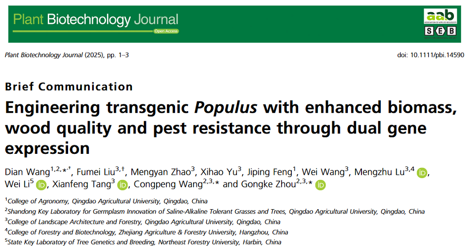 2025年1月24日,beat365中文唯一官网周功克/王殿课题组在《Plant Biotechnology Journal》(中国科学院1区TOP期刊,影响因子10.1)上,在线发表了题为“Engineering transgenic Populus with enhanced biomass, wood quality and pest resistance through dual gene expression”的论文。该研究报道了利用多基因表达技术实现多优良性状聚合育种新策略。将活性氧清除的关键酶超氧化物歧化酶编码基因CSD2和Bt蛋白编码基因Cry3A聚合后在杨树中表达获得了高产、优质和抗虫的转基因杨树新种质。