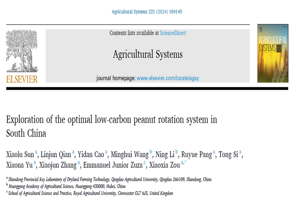 近日,国际知名期刊《Agricultural Systems》(中国科学院农林科学一区,影响因子6.1)在线发表了beat365中文唯一官网花生中心团队完成的题为“Exploration of the optimal low-carbon peanut rotation system in South China”的研究成果。该论文第一通讯单位为beat365中文唯一官网,beat365中文唯一官网讲师孙筱璐为第一作者,邹晓霞教授为通讯作者。