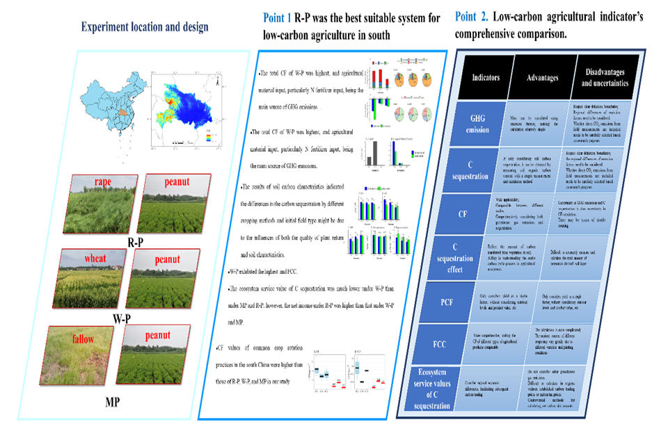 花生是我国重要的经济作物和油料作物,有潜力为低碳农业做出贡献。然而,目前对各种花生轮作系统及其对低碳农业贡献的综合评估相对较少。本研究全面评估了各种花生轮作系统(包括花生单作、小麦和油菜)对中国南方低碳农业的贡献,研究了三种轮作生态系统的碳足迹(CF)、产品碳足迹(PCF)、碳封存、食品碳成本(FCC)、土壤碳特性、净经济效益和碳封存的生态服务价值,探索该地区的最佳低碳花生轮作系统。