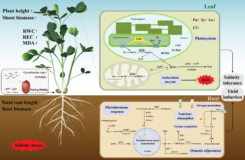 花生是山东省的重要经济作物,因其耐盐性相对较强,近年来在我省滨海盐碱地和内陆次生盐碱地大范围种植。然而,盐胁迫始终是制约我省盐碱地花生产量提升的主要瓶颈。石墨烯被誉为“黑金”,是目前发现的最薄、强度最大、导电导热性能最强的一种新型纳米材料,近年来在作物生产领域展现出广阔应用前景。本研究在前期浓度筛选的基础上,利用适宜浓度的氧化石墨烯浸泡花生种子,使其产生引发效应:(1)种子萌发试验表明,氧化石墨烯引发提高了花生种子发芽率,转录组和代谢组分析表明,氨基酸和苯丙素类相关物质显著富集于花生种子;(2)盆栽试验表明,氧化石墨烯引发有效促进了盐胁迫下花生幼苗植株生长,主茎功能叶片光合作用和抗氧化能力显著增强,根系生长素等合成途径相关基因表达上调,碳氮代谢相关产物积累显著提高;(3)两年大田试验表明,氧化石墨烯引发显著提高了花生荚果产量。