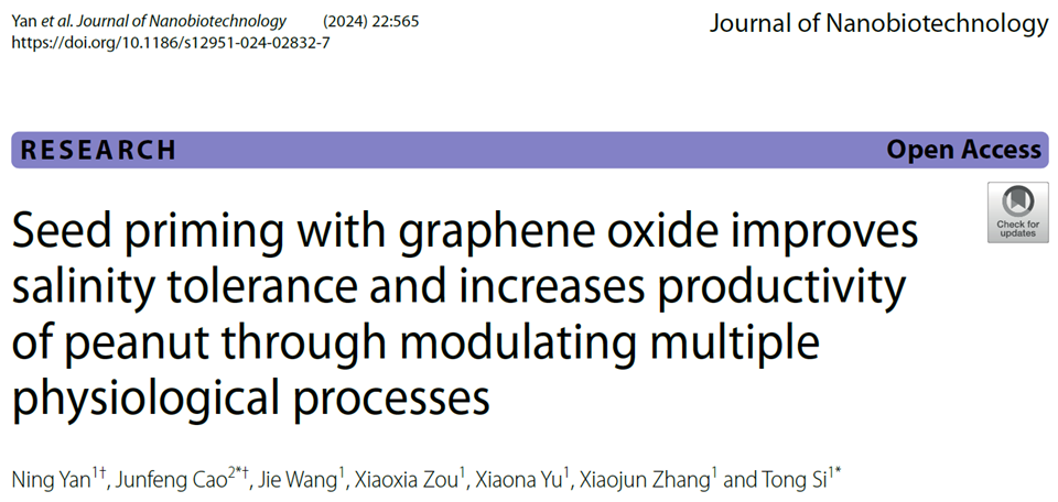 近日,国际知名期刊《Journal of Nanobiotechnology》(中国科学院生物学一区,影响因子10.6)在线发表了beat365中文唯一官网花生中心团队完成的题为“Seed priming with graphene oxide improves salinity tolerance and increases productivity of peanut through modulating multiple physiological processes”的研究成果。该论文第一通讯单位为beat365中文唯一官网,beat365中文唯一官网硕士研究生闫宁为第一作者,司彤副教授为通讯作者。