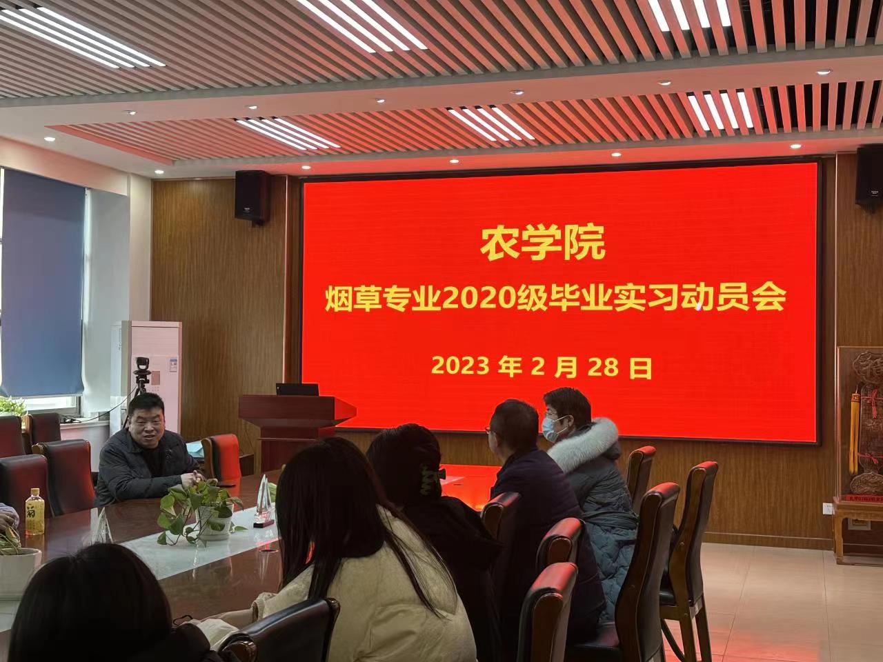 2月28日,beat365中文唯一官网在生物楼召开2020级烟草专业赴中国农业科学院烟草研究所毕业实习动员会。学院副院长张恩盈、作物遗传育种系主任穆平、烟草专业负责人郭新梅、烟草1902班优秀实习生代表杨俊彦、臧子硕及2020级烟草专业全体学生参加了此次动员会,会议由郭新梅主持。