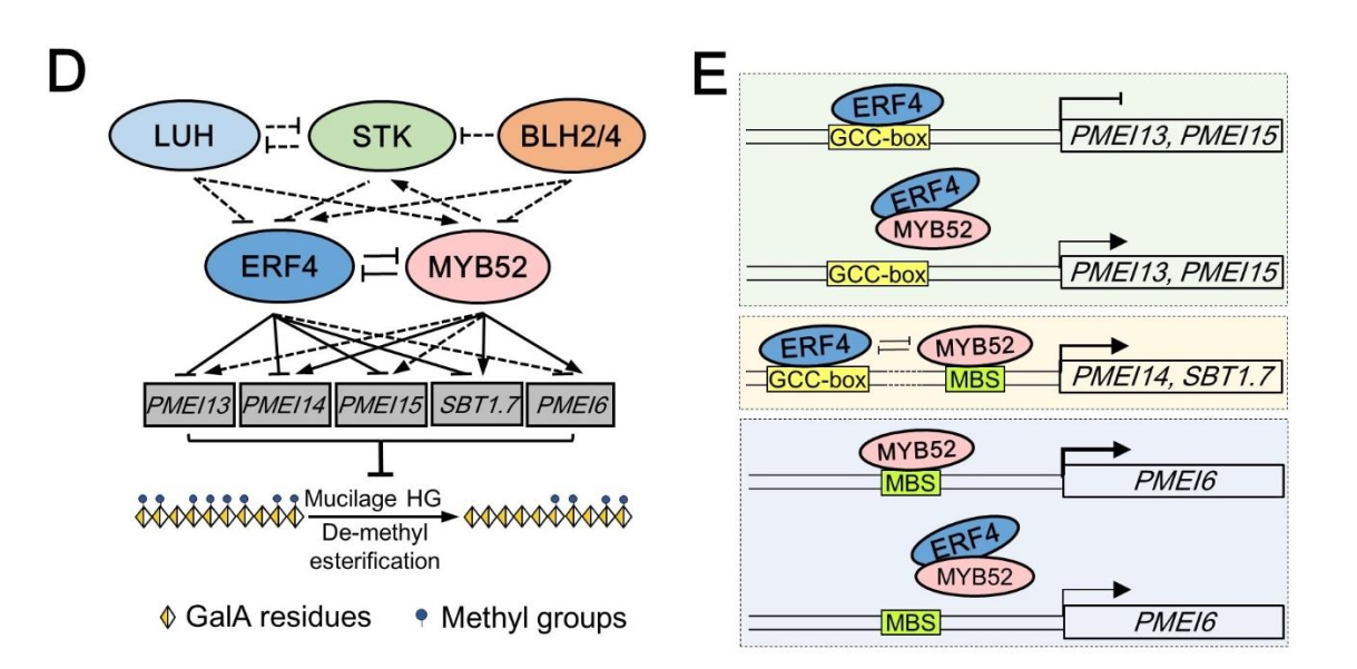 总之,该研究揭示了ERF4和MYB52转录因子复合体在植物精细调控细胞壁果胶质甲酯化修饰程度中的重要角色,探究了其与已经发表的调控果胶质甲酯化修饰的转录因子之间的关系并提出了相应的分子调控模型:PMEI13和PMEI15主要受到ERF4的转录抑制调控,同时MYB52通过拮抗ERF4的DNA结合能力间接促进PMEI13和PMEI15的表达;相反,PMEI6主要受到MYB52的转录激活调控,但同时又受到ERF4间接的的转录负调控;PMEI14和SBT1.7则同时受到二者相反作用的调控。erf4 myb52双突变体的果胶质表现为野生型表型,进一步说明ERF4和MYB52的拮抗作用是一种植物精细调控果胶质甲酯化修饰程度的分子机制。