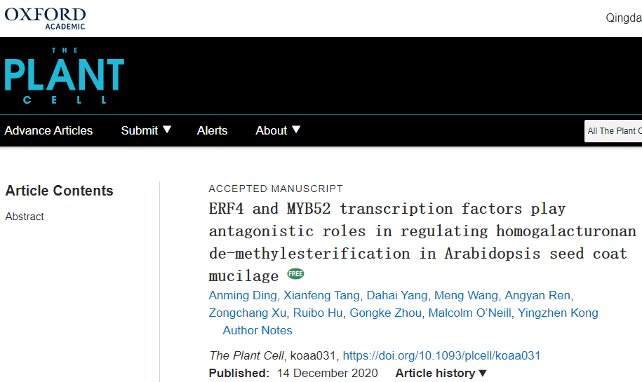 近日,beat365中文唯一官网资源植物与环境工程创新团队成员、beat365中文唯一官网孔英珍教授及其合作者揭示了植物精细调控细胞壁果胶质甲酯化修饰程度的新机制。相关研究内容『ERF4 and MYB52 transcription factors play antagonistic roles in regulating homogalacturonan de-methylesterification in Arabidopsis seed coat mucilage》于12月14日在线发表在《The Plant Cell》(中科院分区:1区,期刊影响因子:8.631)上。