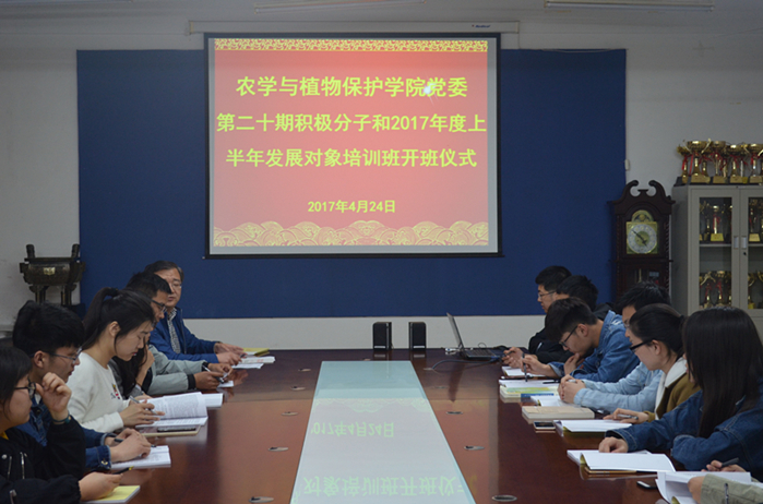 4月24日,农学与植保学院在生物楼n206举办第二十期积极分子和2017年上半年发展对象培训班开班仪式,学院党委副书记,副院长李军、团委书记姜涛、辅导员谷元兴出席本次仪式。