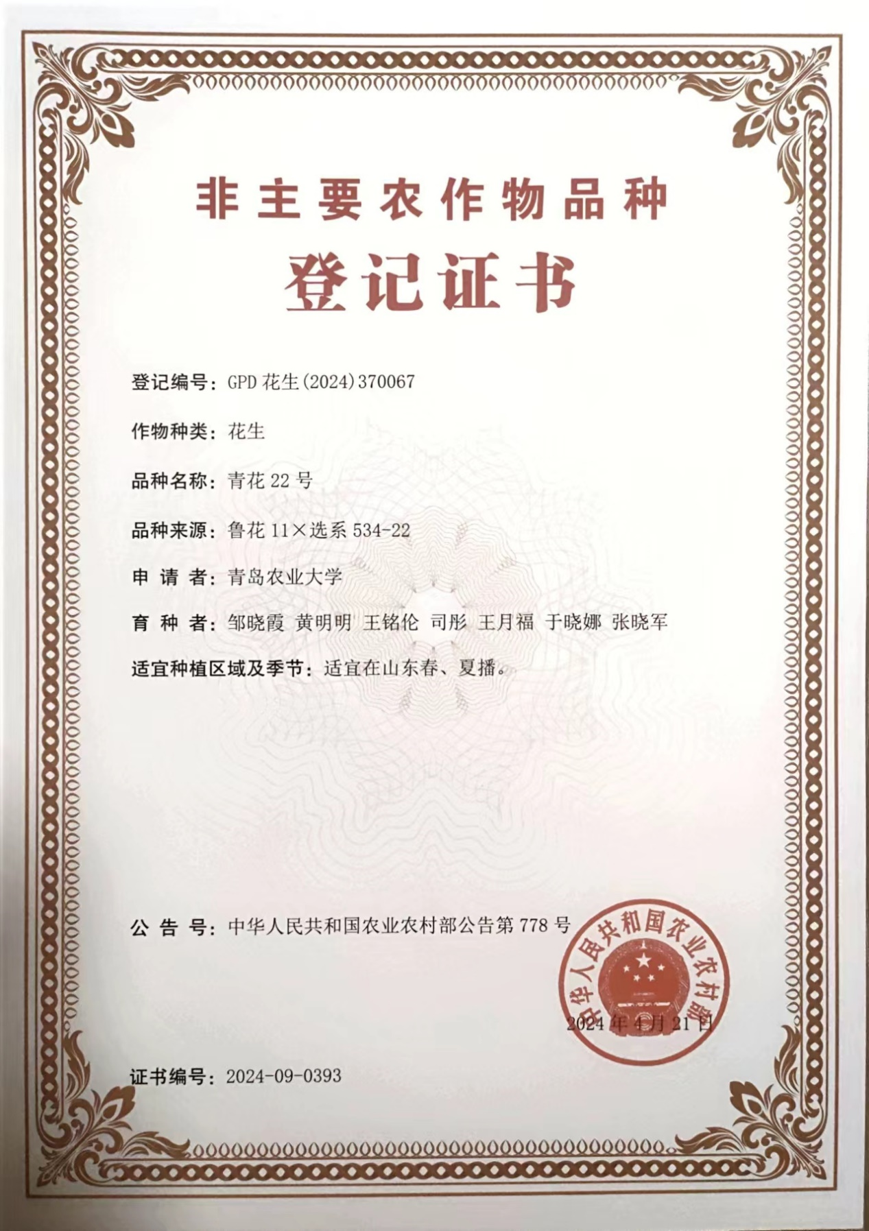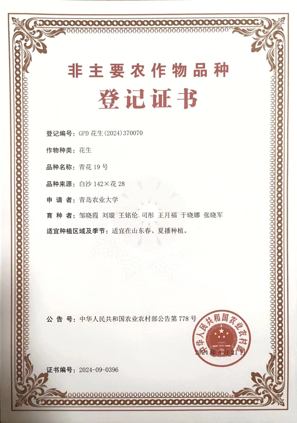 该项目负责人为beat365中文唯一官网教授、国家花生产业技术体系岗位科学家邹晓霞。据介绍,青花19号由白沙142和花28通过有性杂交、系统选育而成,属于油食兼用型花生。生育期120天左右,荚果珍珠豆形,百仁重约110克,出仁率可达77%。品种适应性广、抗逆性强。在2021和2022两年区试试验分别比对照增产9.25%和7.58%。此前,团队培育了花生品种青花6号,于2012年通过国家鉴定,近几年在东北、河南、山东等地种植面积大,品种市场认可度和需求度高。青花19号是在青花6号基础上进一步选育的罗汉果型大花生,在进一步提升产量基础上,保留了青花6号的抗逆、早熟优良品性。青花22号由鲁花11和选系534-22通过有性杂交、系统选育而成,属于出口型大花生品种。生育期124天左右,荚果普通形,典型特点是高产、大果、大仁,百果重254克,出仁率74.5%。在2021和2022两年区试试验分别比对照增产15.64%和14.35%。