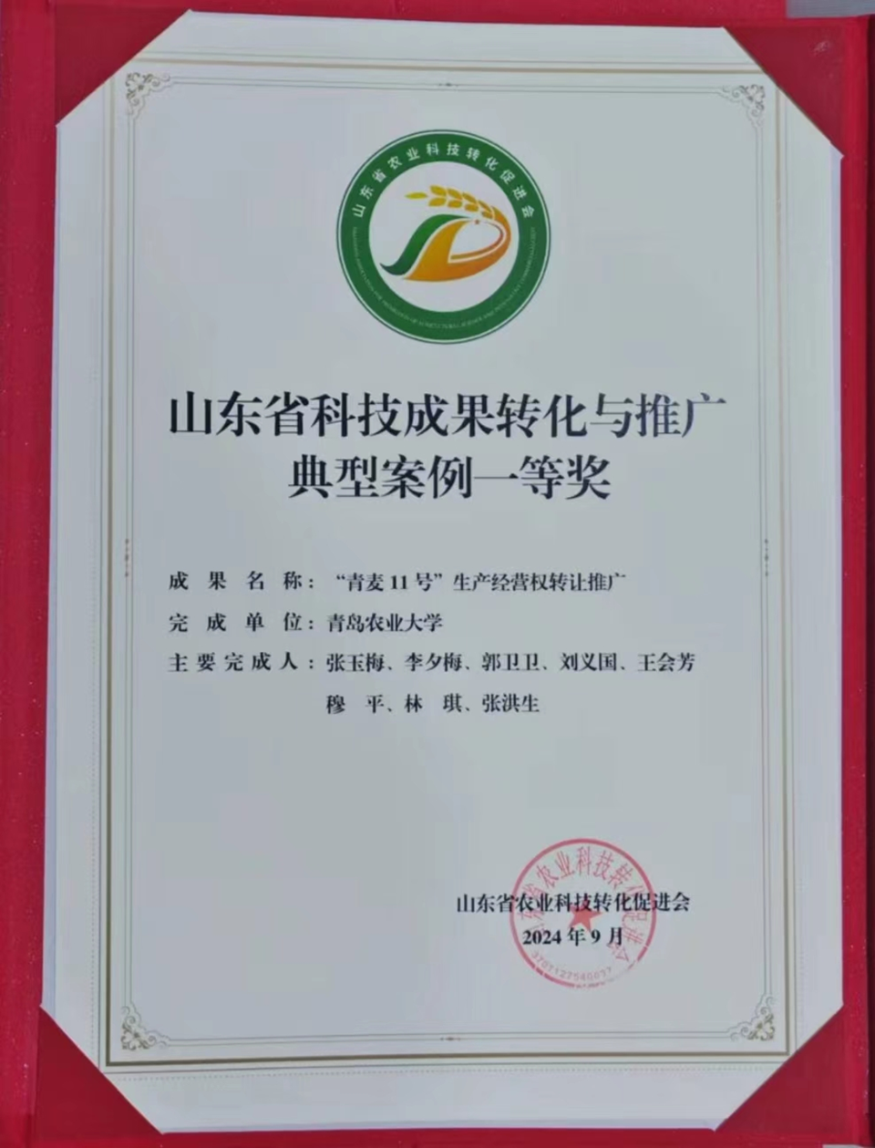 近日,首届中国(山东)现代高效农业科技博览会在烟台市成功举办。会议期间举行了山东省农业科技成果转化与推广典型案例颁奖暨“农科好物”品牌产品发布会。本次会议共评选出一等奖12项,二等奖21项,优秀奖21项,我院张玉梅教授团队“‘青麦11号’生产经营权转让推广”成果荣获山东省科技成果转化与推广典型案例一等奖。