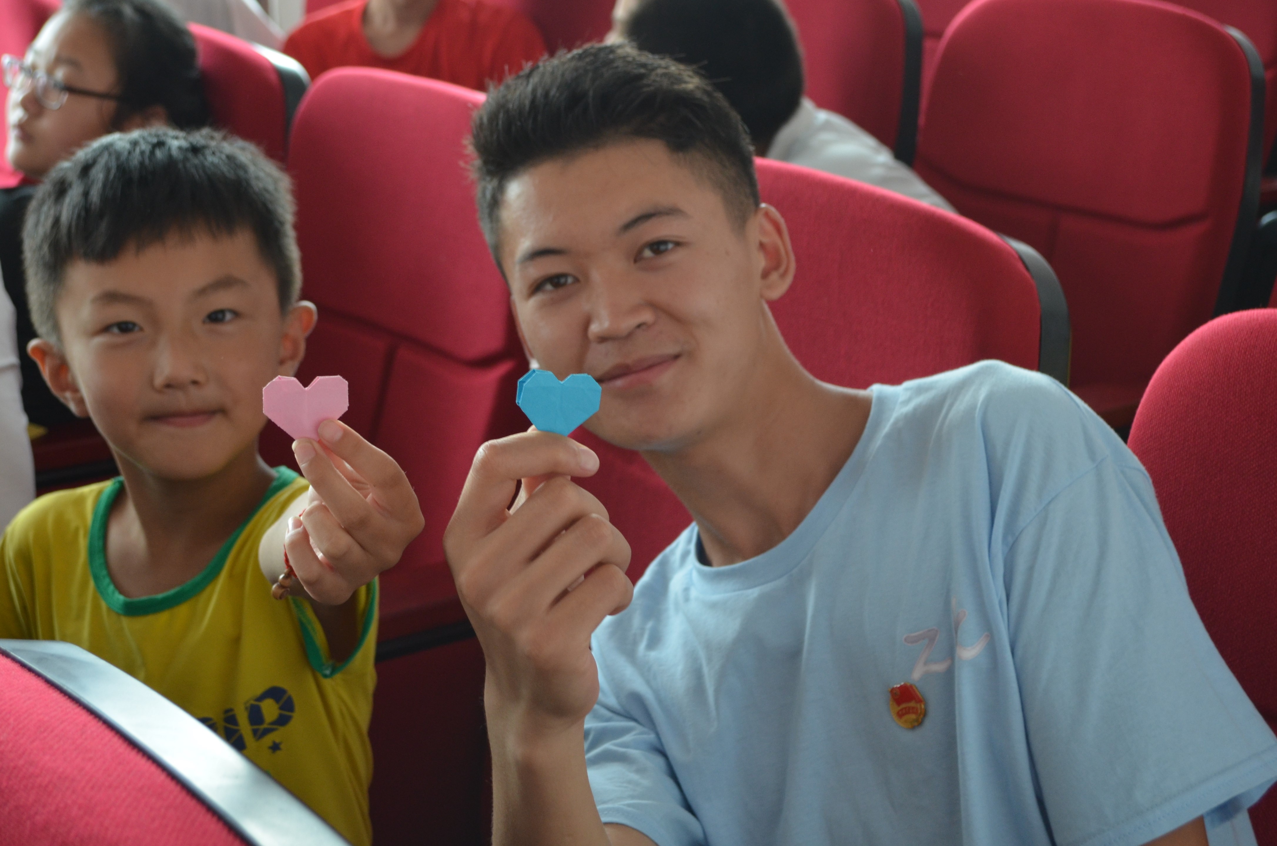 7月14日下午,为提高小朋友对爱心支教活动的兴趣,黄悦为其开展了一堂手工折纸课,黄悦一一为小朋友分发折纸,一步一步带领小朋友折叠了花朵、爱心以及改良版的蝴蝶结。期间,每当小朋友提出询问,黄悦都会悉心回答指导,以确保每个小朋友完成自己的手工艺品。