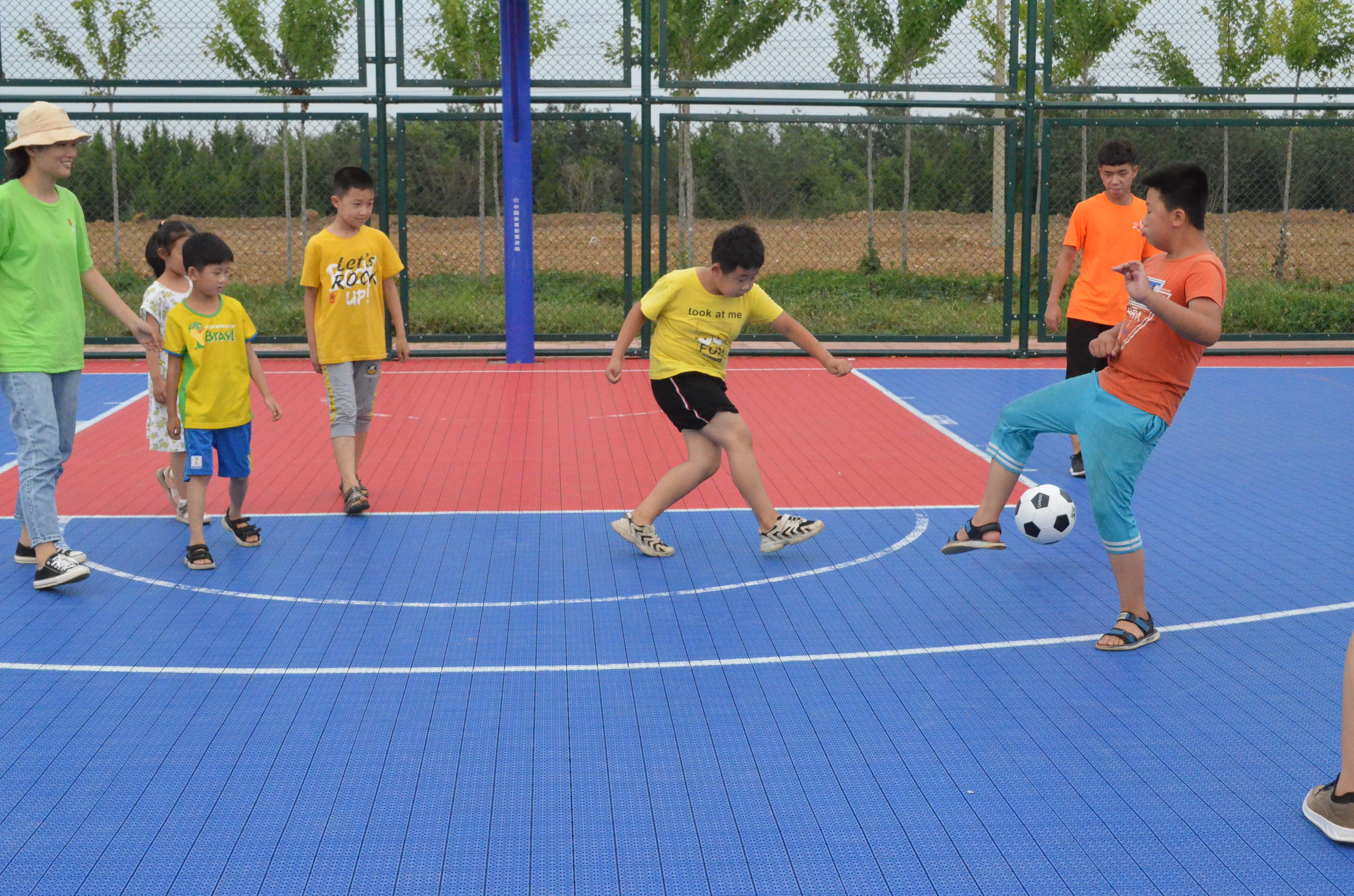 7月15日下午,王人杰教授孩子们足球课。王人杰通过图片、视频、卡通人物等多种方式向小朋友们介绍了与足球相关的基本理论知识和赛事。在小朋友们对足球有了基本的了解之后,队员们将小朋友们分组教学。一组队员留在教室进行作业辅导,一组队员带领剩余同学到楼下进行足球活动。孩子们在烈日下挥洒汗水,队员们耐心教导并与他们一同进行游戏。