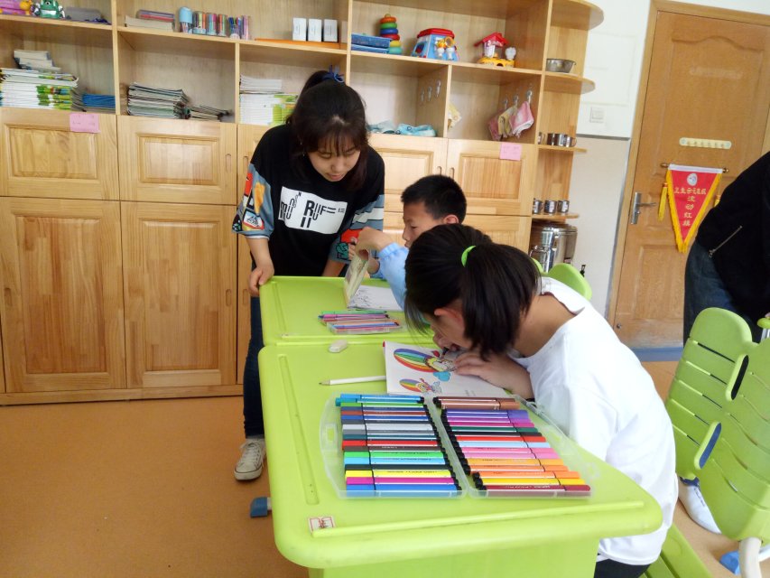 到达特教中心,一张张洋溢着欢乐而又纯真的面孔展现在我们面前。我们接管的是三年级,特教中心负责人把我们带入教室,小朋友们用热烈的掌声欢迎我们。第一堂课是教小朋友们画画,彩色的画笔在纸上挥舞,每一幅画都怀揣着孩子们对未来的憧憬。第二堂课,我们教小朋友们学了手指舞“为中国点赞" , 孩子们很感兴趣,认真的学习动作,舞动着稚小的手指。我们与小朋友们变得熟络起来,到了离开的时候,我们为小朋友送上了爱心祝福,他们也依依不舍的向我们道别。