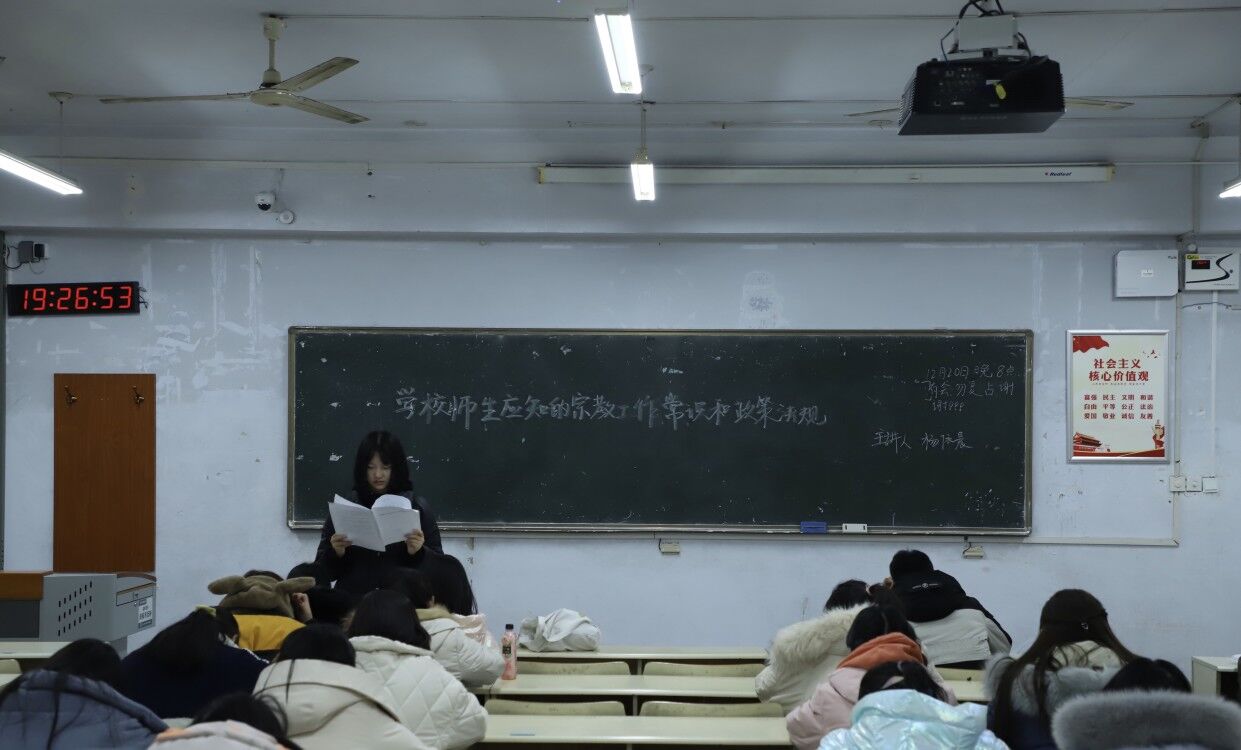 团课伊始,主讲人带领全体同学一起学习了《学校师生应知的宗教工作常识和政策法规》,使大家全面了解我国的宗教政策,树立正确的世界观、人生观。随后,全体同学一起学习了《高等学校新冠肺炎疫情防控手册》,主讲人提醒同学们要正确配戴口罩、勤洗手、勤通风,做好个人防护,同时强调,当前疫情防控工作仍处于校园安全工作的第一位,大家要树立疫情防控常态化意识,积极配合学校疫情防控工作,严守疫情防控要求。最后,同学们围绕“作为在校大学生,我们应该如何响应新冠肺炎疫情防控工作”展开积极讨论,同学们纷纷表示,会积极响应国家号召,从自身做起,做好个人防护,对自己和身边的人负责。