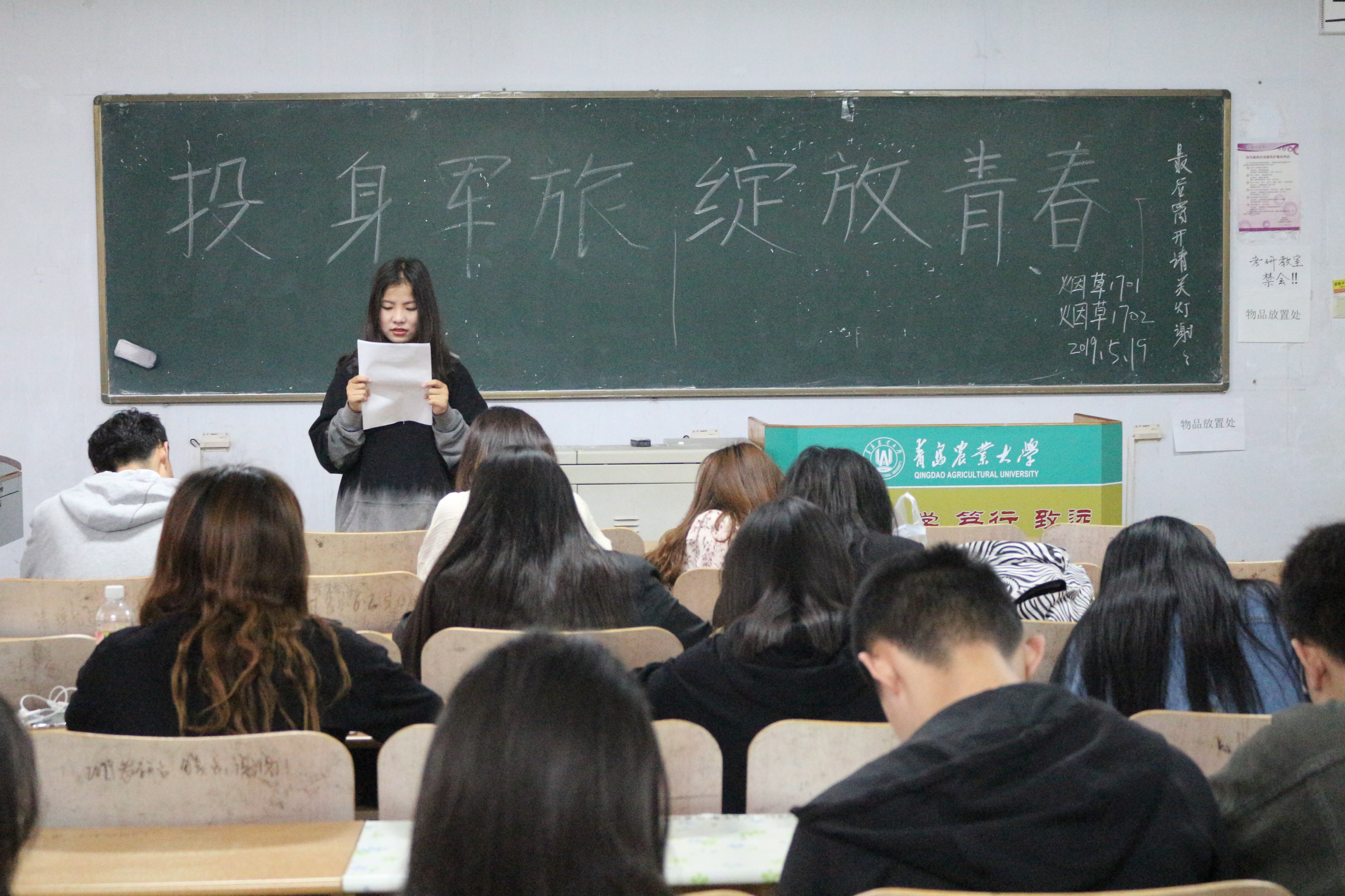 为响应习近平总书记提出的强军兴军伟大号召,鼓励当代大学生在军营中磨炼自我,5月19日,beat365中文唯一官网于教学区开展“投身军旅,绽放青春”主题团课,学院2017、2018级全体同学积极参加。