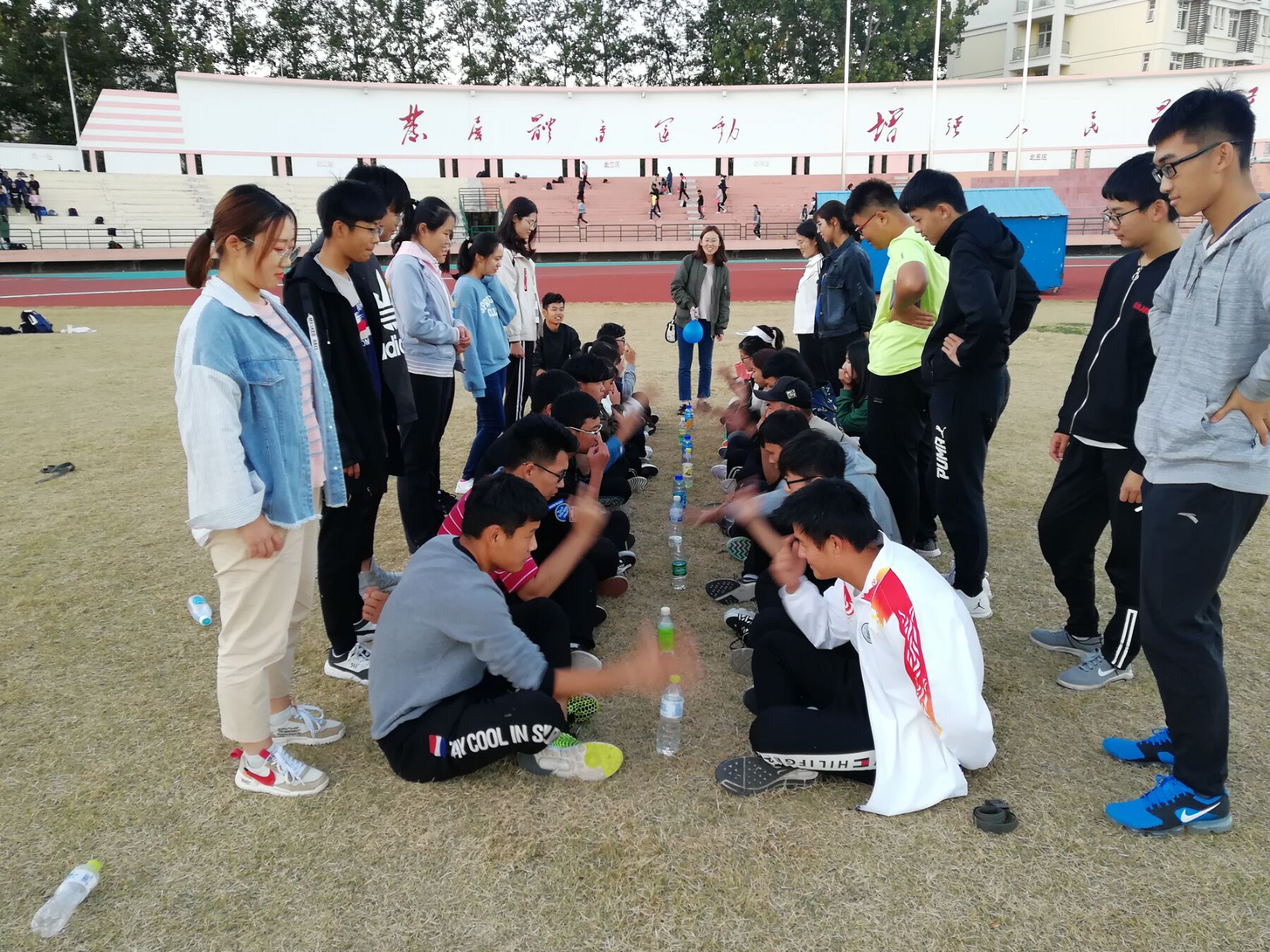 运动会共分为企鹅漫步、两人三足接力、托球接力、听口令抢水瓶、疯狂踩气球等个项目。运动员均分为两组,记为1组、2组,评比方式采用积分制,参赛同学都尽力完成每个项目,全身心的投入比赛,同学们将青春的光芒发挥到极致,经过激烈而有趣的角逐最终2组同学获得胜利。通过此次趣味运动会,增进的班主任和班主任助理对班级的了解,促进了同学们的交流,增强了同学们的团队合作精神和凝聚力。
