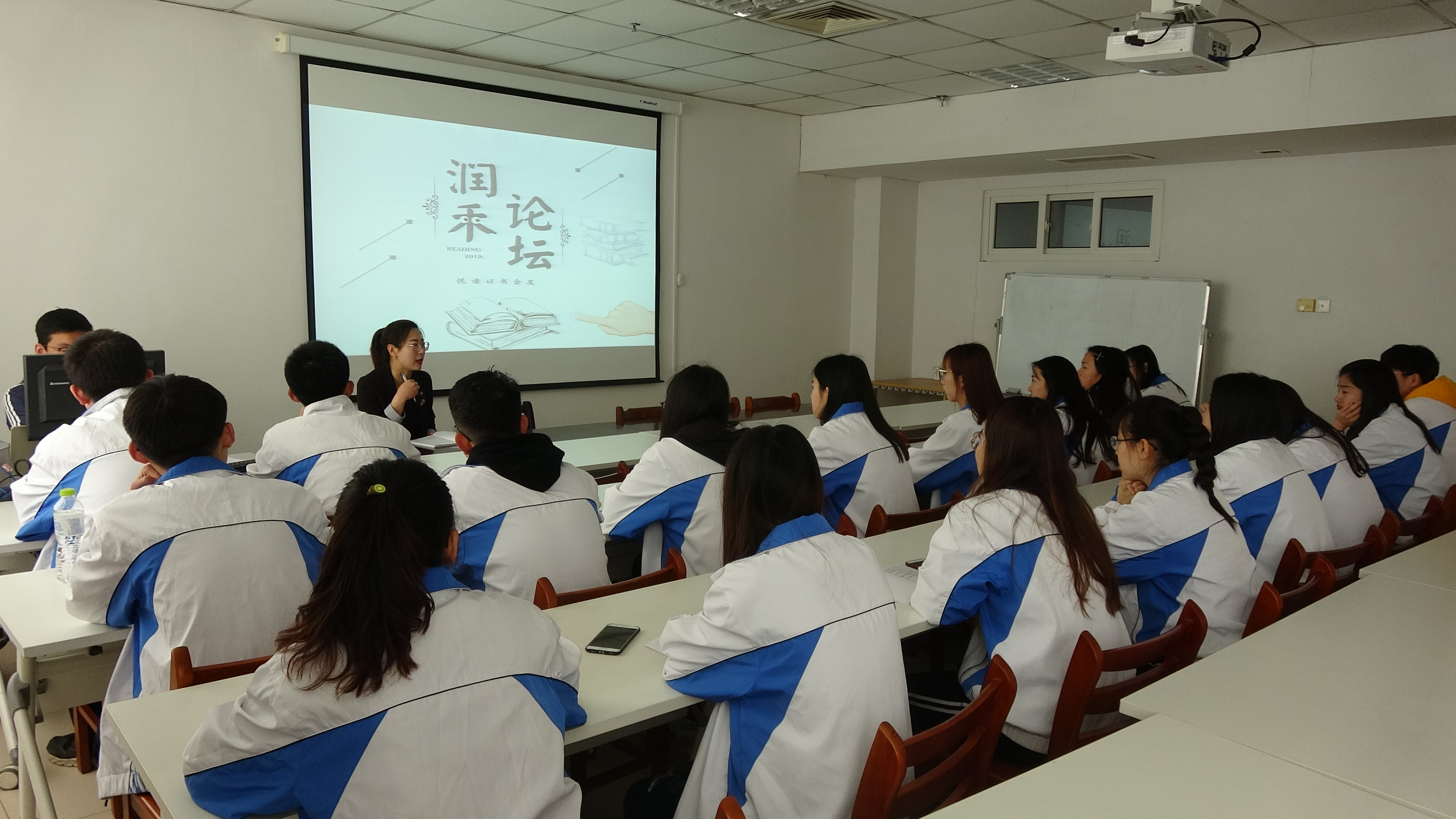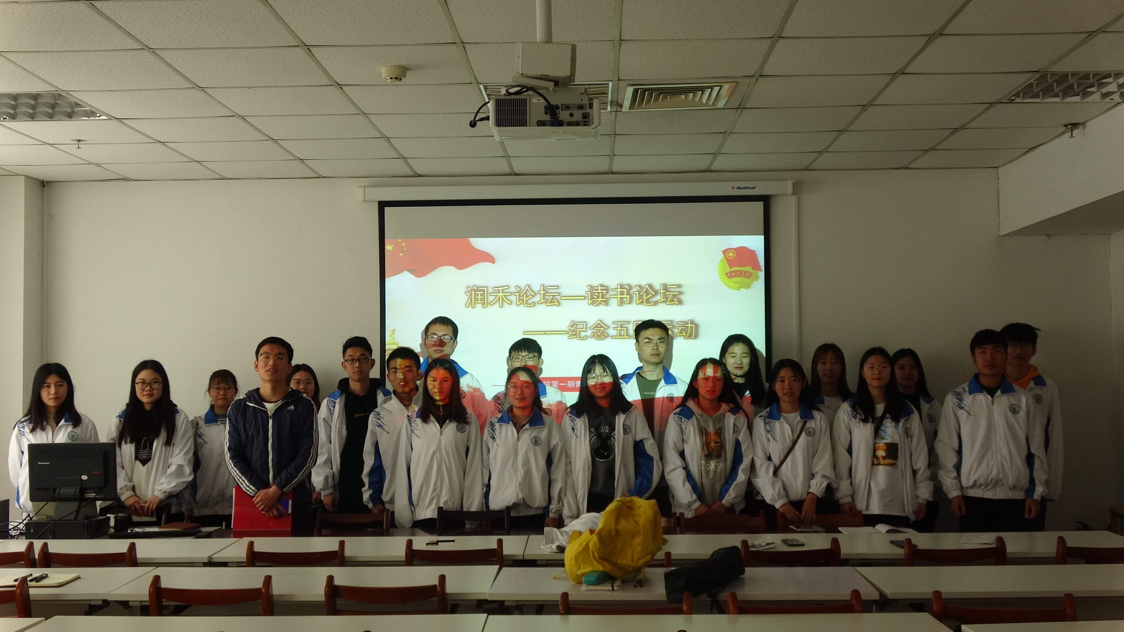 活动伊始,刘宁围绕“有谁在坚持每天读书”、“我们每天将空闲时间都用来做什么了”、“我们能否每天挤出30分钟的时间阅读”三个问题引导同学们思考读书的重要性,她指出,读书非常重要,但是很少有人能够真正将读书变成一种习惯坚持下去,她建议大家能够每天拿出30分钟的时间进行阅读,并且建立读书打卡、读书心得分享的QQ群,表示愿意与大家一起相互监督,共同坚持。随后,陈同分享周策纵的《五四运动史》一书,带领大家回顾了五四运动的历史,层层递进,激发了同学们的爱国热情。最后,四位同学上台诵读《少年中国说》,以此纪念这一伟大的爱国主义运动。活动结束,同学们合影留念,并在读书册上留下了自己的名字,承诺将阅读进行到底。