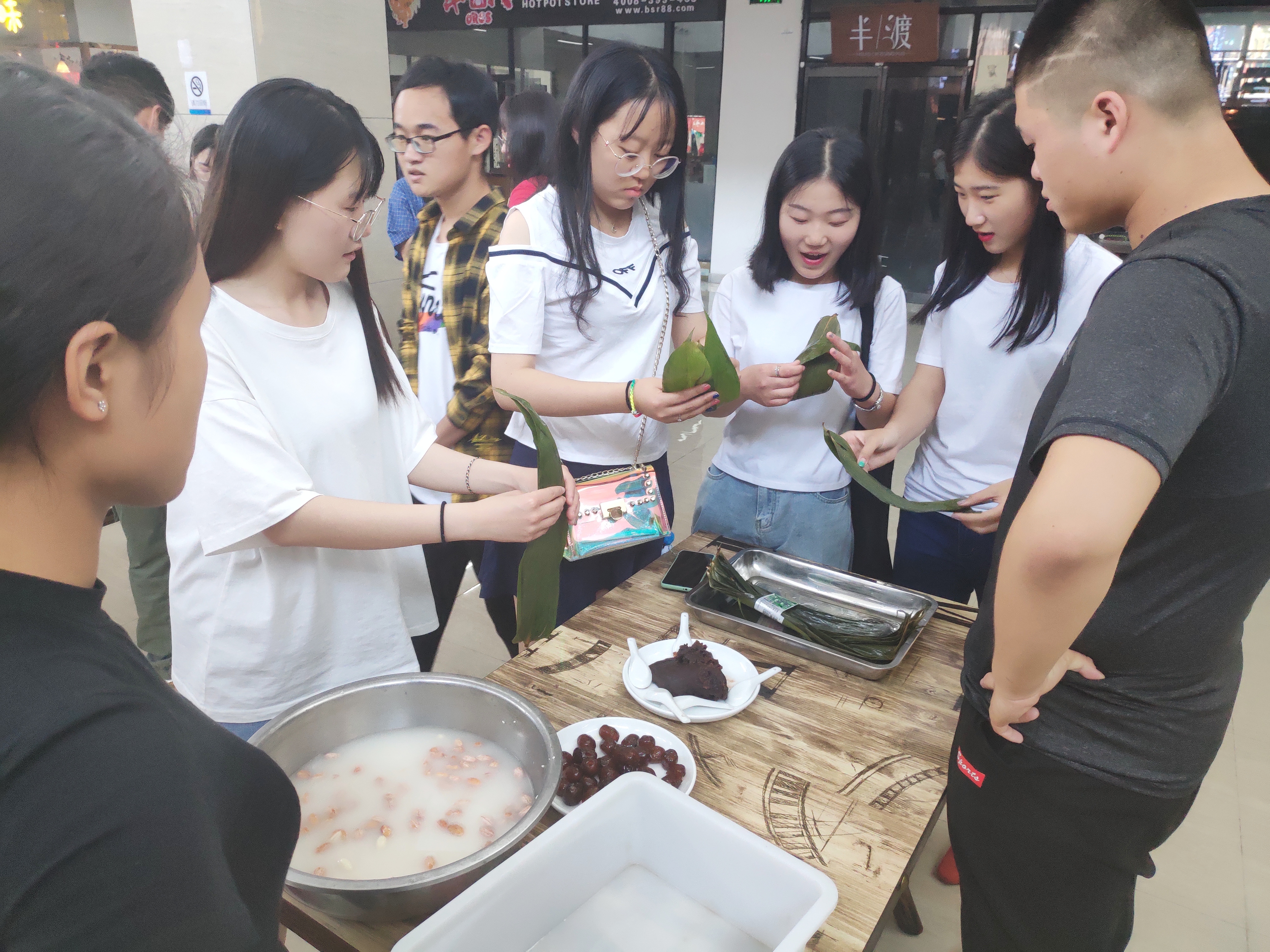 活动现场,学生们把提前泡好的糯米、红枣、花生、粽叶等材料整齐摆放分类。大家围在一起,纷纷拿出看家本领,分工明确,各显神通。包粽子过程中,大家畅谈端午节的习俗和文化历史。经过2个小时的包粽活动,100多个形态各异、饱含祝福的粽子迅速成型。随后,包好的粽子现场煮熟,不一会儿,热气腾腾的粽子就出锅了,大家脸上都洋溢着幸福的笑容。