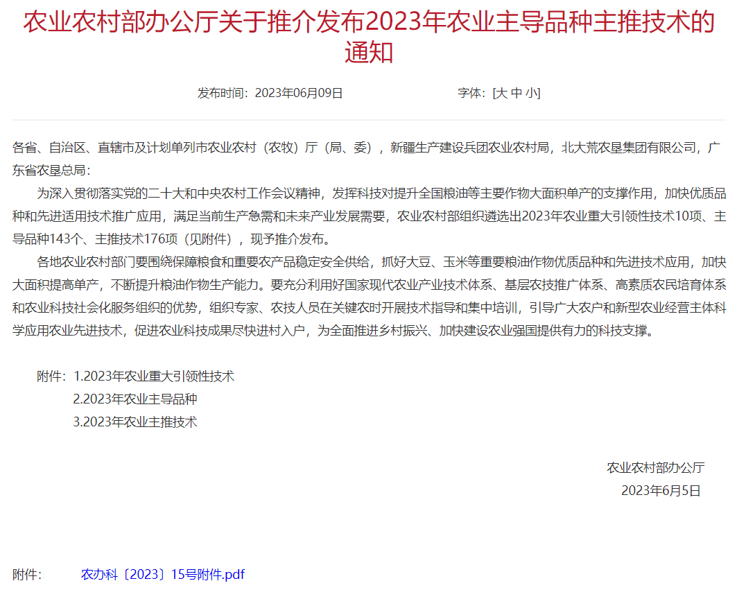 近日,农业农村部发布了《农业农村部办公厅关于推介发布2023年农业主导品种主推技术的通知》,组织遴选出2023年农业重大引领性技术10项、主导品种143个、主推技术176项。beat365中文唯一官网刘树堂教授和姜雯教授团队研发的“夏玉米精准滴灌水肥一体化栽培技术”被列为2023年农业农村部农业主推技术。