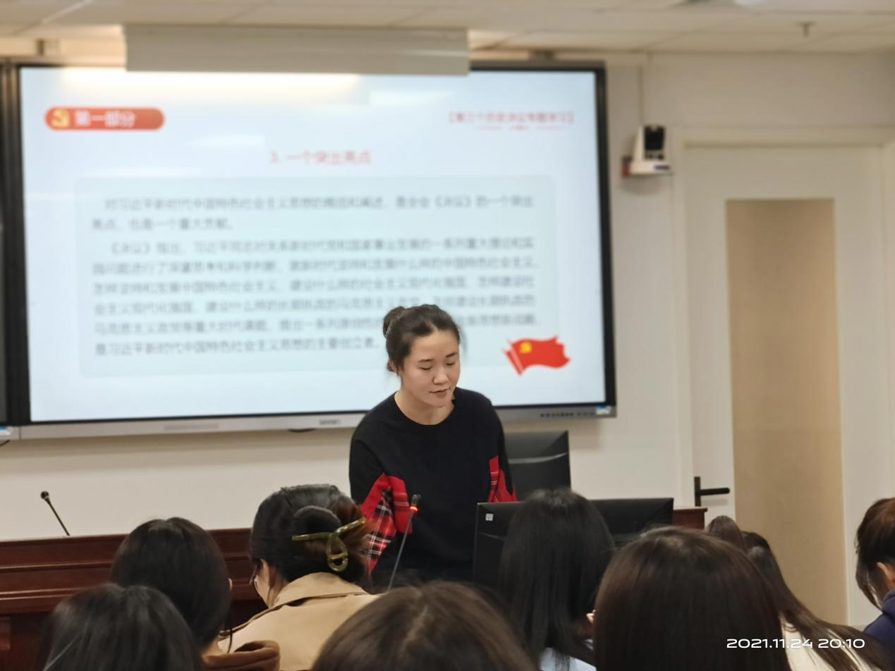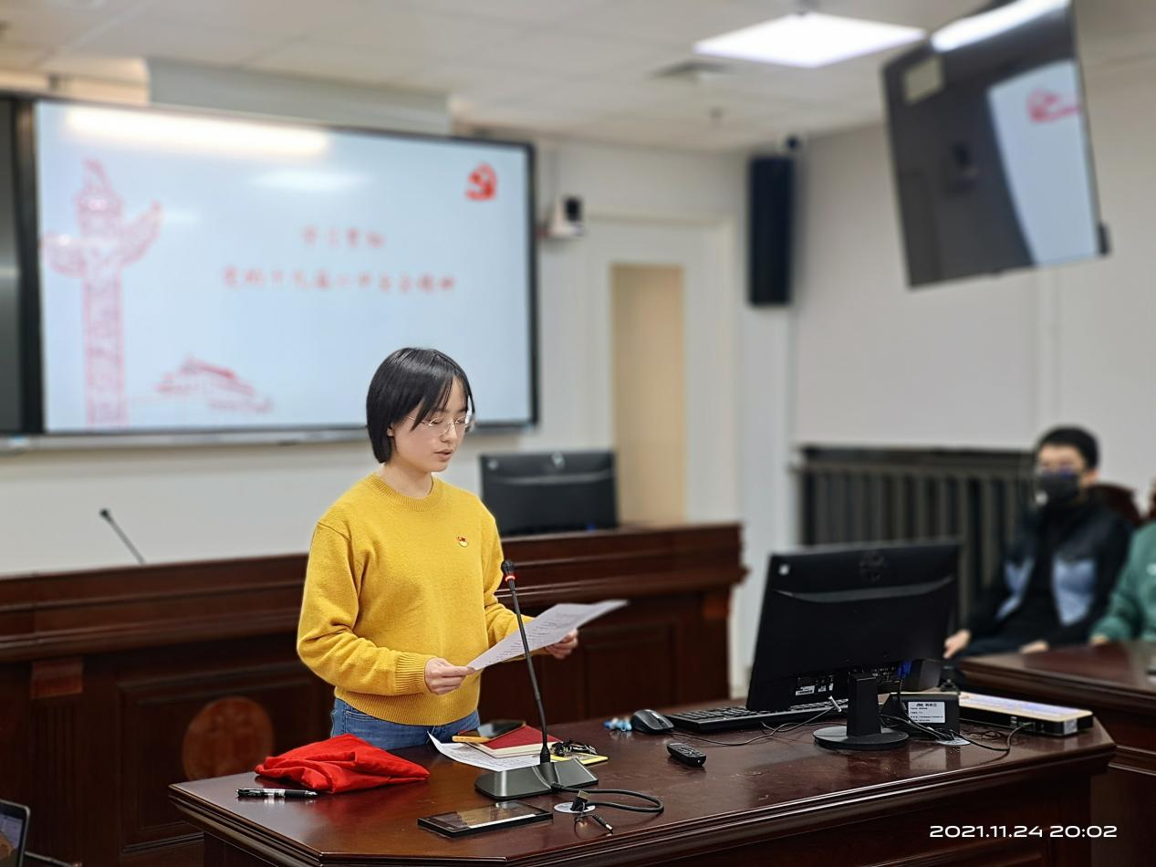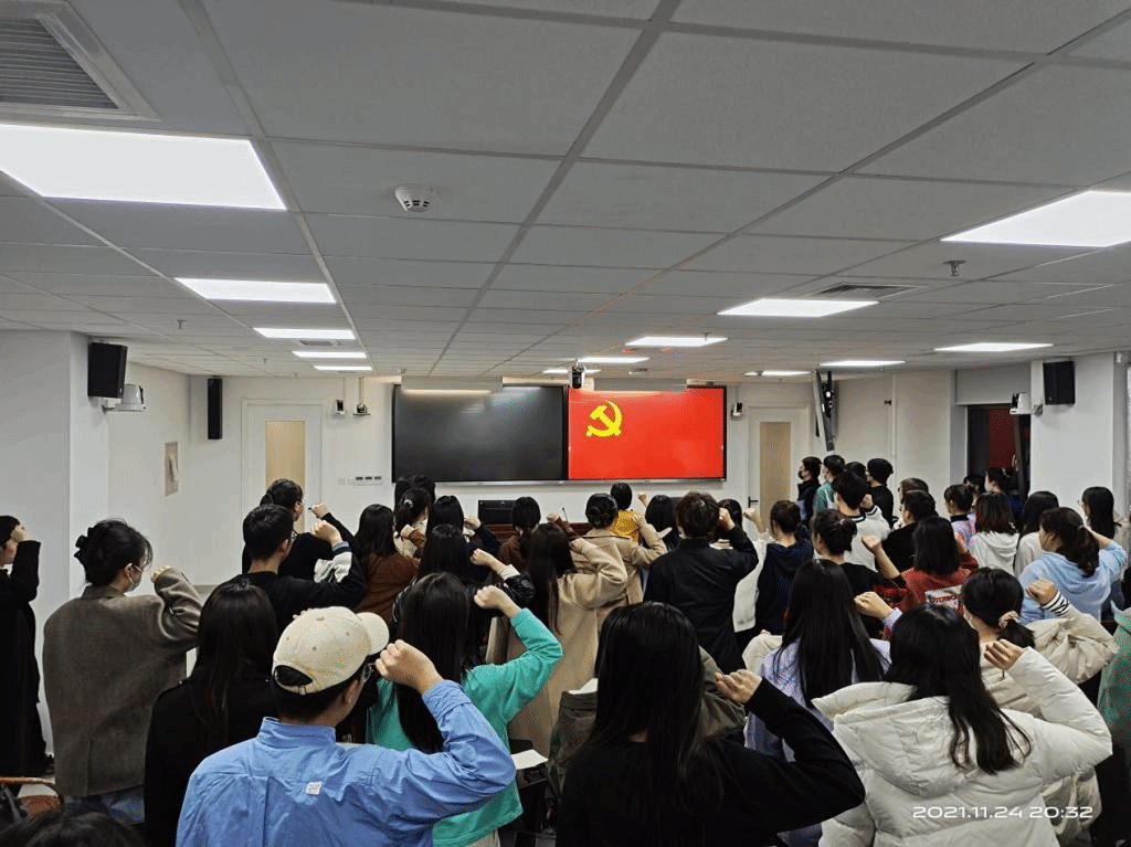 与会党员集体学习了十九届六中全会公报和《中共中央关于党的百年奋斗重大成就和历史经验的决议》。随后,今年会官网法律硕士研究生党支部副书记刘文静同志分享了自己的学习心得,同大家从整体把握和要点分析两个方面体悟《决议》精神内涵。最后,与会党员奏唱了国际歌并重温入党誓词。