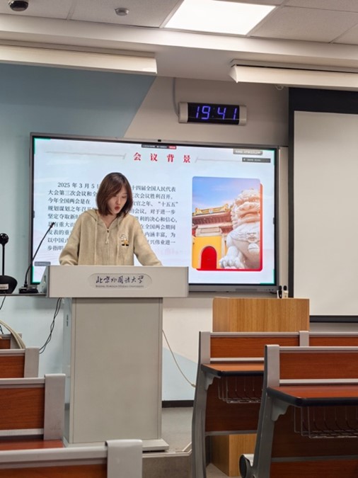 在本次学习会上,郝雨辰书记率先发言,主要从会议背景、学习内容、学习讨论和学习总结四个部分展开了领学。郝雨辰书记首先介绍了会议背景,强调今年全国两会是在“十四五”规划收官之年、“十五五”规划谋划之年召开的一次十分重要的会议,对于进一步坚定夺取新时代中国特色社会主义新胜利的决心和信心,具有重大而深远的意义;然后就具体学习内容展开,带领同学们深入研读并学习了习近平总书记在江苏代表团审议时的重要讲话精神、习近平总书记在看望民盟、民进、教育界委员并参加联组会时的重要讲话精神、习近平总书记在出席解放军和武警部队代表团全体会议时的重要讲话精神、政府工作报告的主要内容及精神、以及全国人大常委会、全国政协常委会工作报告、“两高”报告中相关内容等五个方面的内容。郝雨辰书记强调了学习两会精神对于党员个人成长以及党支部发展的重要性。她指出,两会承载着国家发展的重要决策与战略方向,深入领会两会精神能够让党员们更好地把握时代脉搏,将个人的学习与实践紧密结合到国家的发展需求之中。随后,书记带领全体党员对两会的核心内容进行了系统梳理,从政府工作报告中的关键举措到民生保障领域的重要部署,都进行了详细解读,让党员们对两会精神有了更为直观和深入的理解。