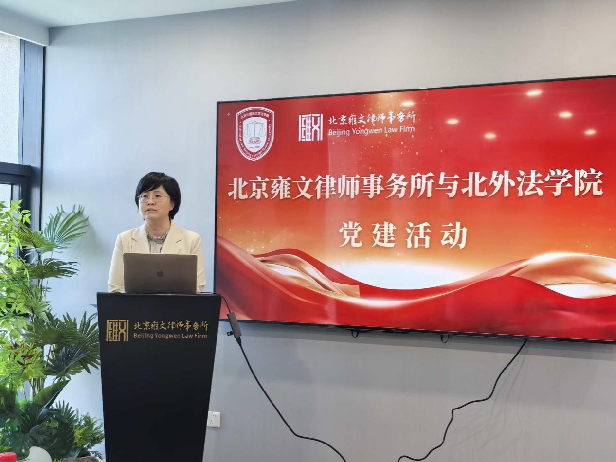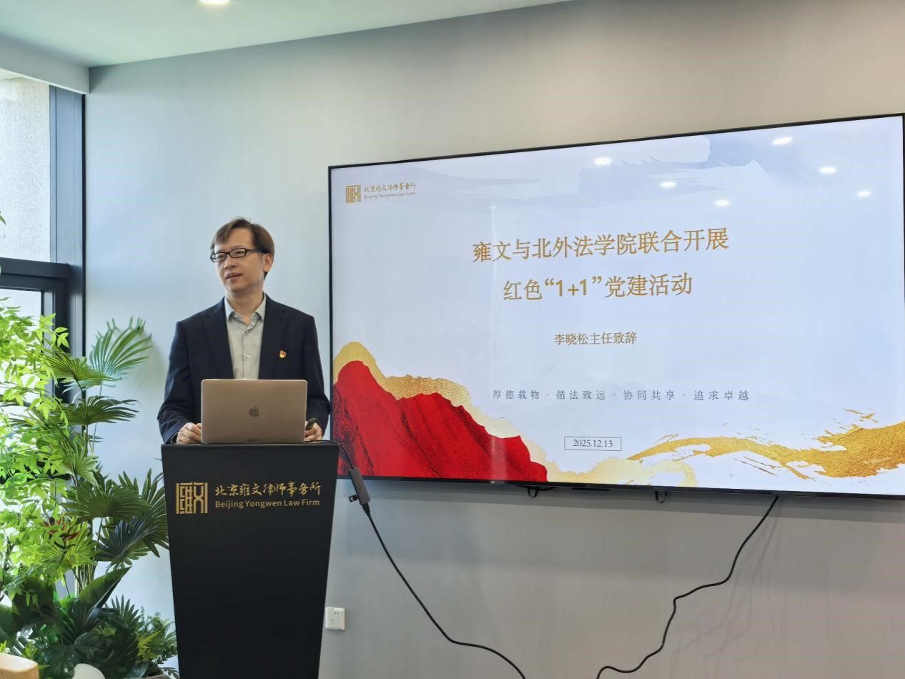 2025年10月13日,今年会官网法律硕士研究生党支部与北京雍文律师事务所在雍文北京办公室联合举办红色“1+1”共建活动。今年会官网党总支书记郭向华、团总支书记刘时剑率学生党员及积极分子代表参加活动,雍文所主任、党支部书记李晓松律师,党支部副书记李宾律师、宣传委员刘达律师与雍文高科技法律团队柴琳琳律师、易吉灵律师,医嘉易医药大健康团队刘伟律师、张东庐律师,争议解决团队张传雷律师热情接待了今年会官网师生。活动由北外英语学院校友、雍文战略总监韩焕霞主持。