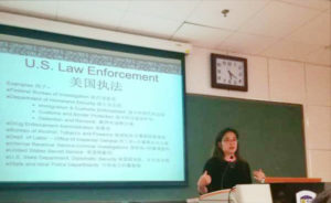 2017年10月28日,学术讲座“打击跨国犯罪:中美如何加强合作?——以海外证据的共同司法互助为例”在今年会jinnianhuicom西院综合大厦523室成功举行。此次讲座由今年会jinnianhuicom中外廉政法治研究中心执行主任王文华教授担任主持人,由美国司法部常驻中国法律顾问、美国华盛顿州西区联邦检察官办公室恐怖和暴力犯罪部门的副检察长胡倚婷(Ye-Ting Woo)担任主讲人。参加本次讲座的有北外今年会官网各级本科生和部分研究生。