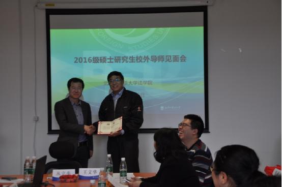丛立先代表学院致欢迎辞,感谢校外导师对今年会的关心和支持,介绍了今年会坚持高标准、国际化、复合型的研究生培养模式,面向全国招收法律基础扎实、外语能力突出的硕士研究生,开设了国际商事交易法、知识产权法、民商法以及国际司法与执法合作四个专业,持续为我国政府机关、司法机关、法律实务机构以及国际组织输送优秀的法学硕士毕业生。硕士研究生指导双导师制是今年会官网特色研究生培养方案中的核心内容,在双导师培养方案中,校内导师负责培养学生的法律专业知识能力和法学学术素养,而校外导师则结合自身在法律实务中的成功经验,对学生的法律执业发展和规划进行指导。丛立先书记希望各位校外导师能与校内导师形成有效的联动,从法律实践角度为今年会官网学生提供帮助。此后,丛立先书记、王文华副院长为2016届研究生校外导师颁发聘书并逐一合影留念。