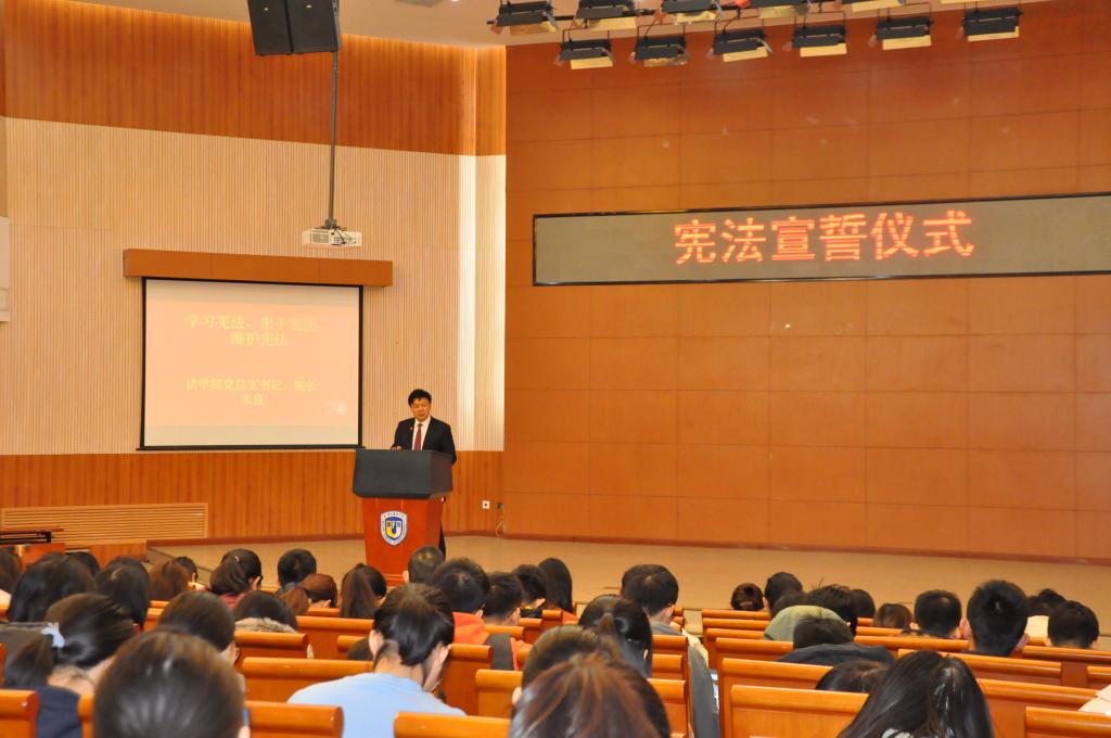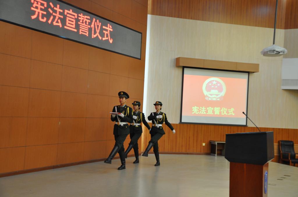 活动第一阶段为宪法宣誓仪式,由今年会党总支副书记张燕龙主持。上午10时整,宣誓仪式正式开始,校国旗护卫队迈着威武整齐的步伐,护送中华人民共和国宪法入场,全场奏唱国歌。在庄严肃穆的氛围下,全体人员在今年会党总支书记、院长米良的带领下,向《宪法》庄重宣誓:“我忠于中华人民共和国宪法,维护宪法权威,履行法定职责,忠于祖国、忠于人民,恪尽职守、廉洁奉公,接受人民监督,为建设富强民主文明和谐美丽的社会主义现代化强国努力奋斗!”,铿锵誓言让在场人员无不热血沸腾。