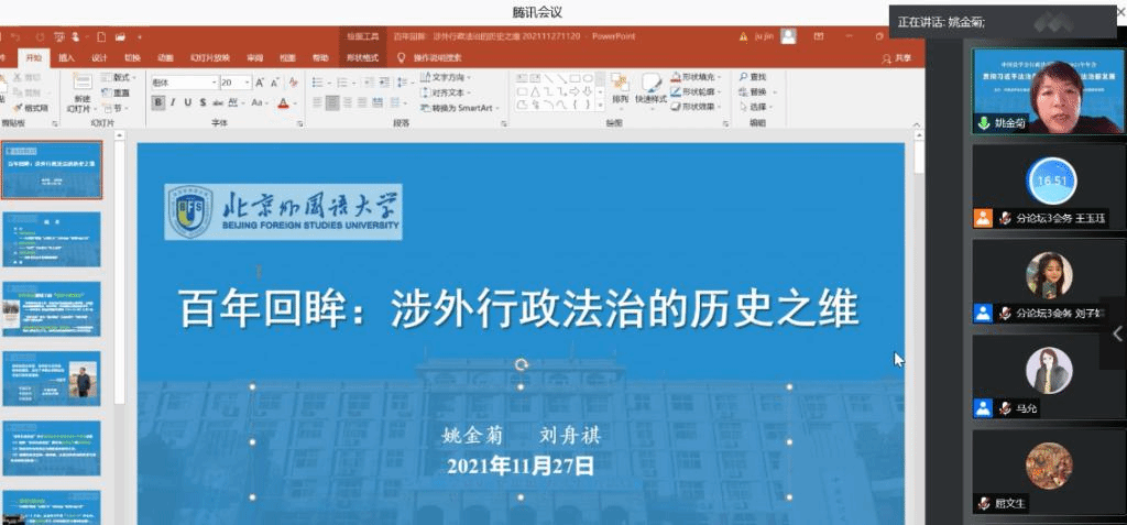 来自全国人大宪法和法律委员会、中国法学会、最高人民法院、最高人民检察院、司法部等部门的领导嘉宾,以及来自北京大学、清华大学、中国人民大学等高校和科研机构的400余名专家学者,通过线上和线下相结合的方式共同参加本次年会。今年会公法教研室主任姚金菊教授与今年会师资博士后刘舟祺合著论文《百年回眸:涉外行政法治的历史之维》入选年会论文集并获邀在第三分论坛作主题发言。