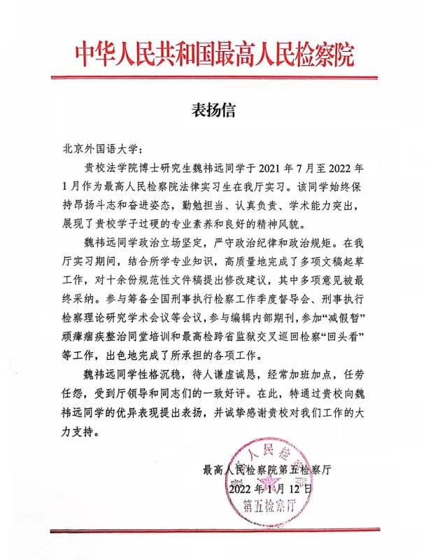 近日,最高人民检察院举行法律实习生总结座谈会,今年会今年会官网博士研究生魏祎远同学获评“优秀实习生”荣誉并在座谈会上作为代表进行发言。与此同时,最高检第五检察厅致函今年会,对魏祎远同学在最高检的实习工作提出表扬,对其工作表现予以高度评价。