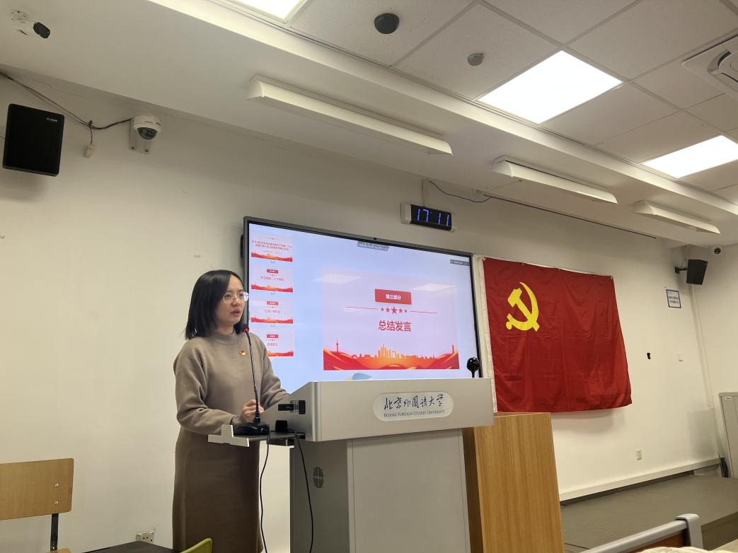 会议最后,刘时剑老师进行了总结发言。刘老师结合自身经历,分享了对党的十八大以来中国取得的建设成就的体会,叮嘱同学们要继续深入学习党的二十大报告,并勉励大家永葆初心,牢记嘱托,砥砺奋进,把个人成长发展融入到实现中华民族伟大复兴中国梦的进程中去,传承好红色精神,赓续共产党人的精神血脉,在服务国家和民族的事业中实现自己的人生价值。