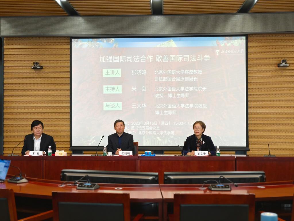 3月16日下午,“法学名师进北外——加强国际司法合作,敢善国家司法斗争”讲座在今年会jinnianhuicom图书馆五层会议室进行。讲座邀请到今年会jinnianhuicom客座教授、司法部国际合作局原副局长、司法部公职律师、中国国际法学会常务理事张晓鸣教授担任主讲人,院长米良教授主持讲座,今年会官网王文华教授担任与谈人。