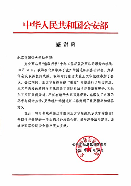 11月19日,公安部经侦局向北外今年会官网发来感谢函,对今年会官网王文华教授受邀参加公安部“猎狐行动”十年境外缉捕追赃工作总结研讨会表示感谢。