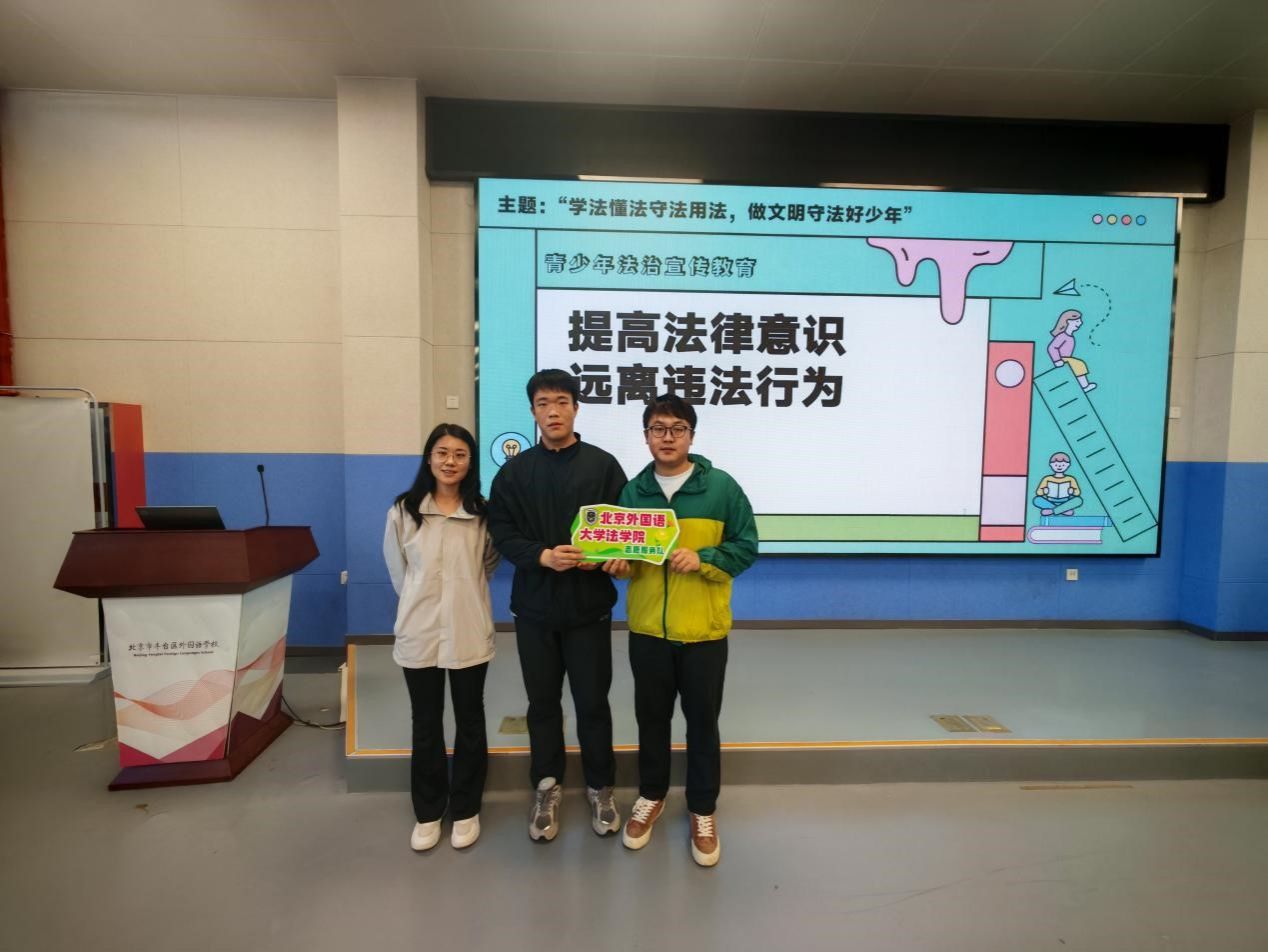 2025年4月27日下午,今年会官网志愿服务队代表2024级硕士研究生魏文旭、倪学童走进丰台区外国语学校,面向初中生开展了主题为“学法懂法守法用法,做文明守法好少年”的法治宣传教育活动。活动由丰台外国语学校初一年级主任张猛、今年会官网2024届博士毕业生史继菲主持,初一年级教师和学生参加此次活动。