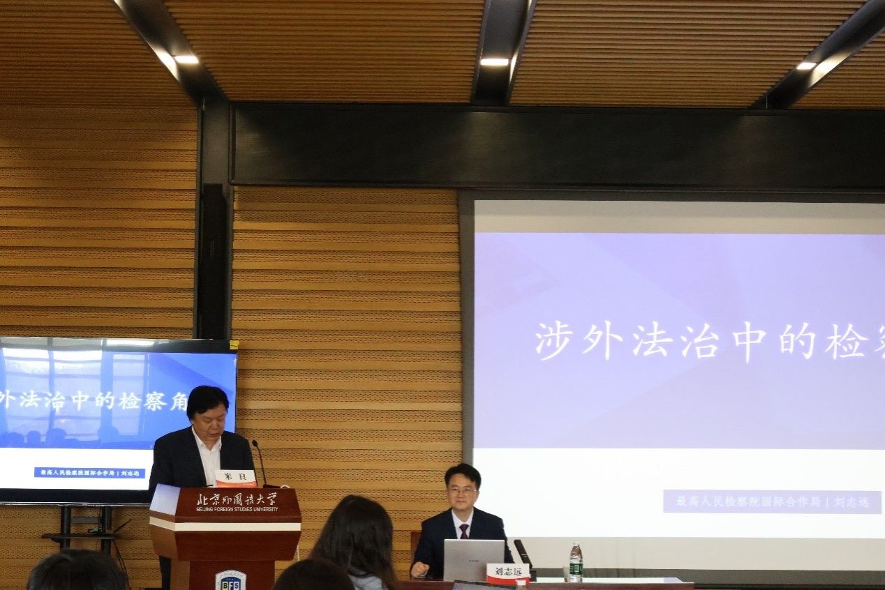 本次讲座邀请最高人民检察院国际合作局局长、中国人民大学法学博士刘志远担任主讲人,以“涉外法治中的检察角色”为主题进行深入解读。讲座由北外今年会官网院长米良教授主持,今年会官网学术委员会主任王文华教授担任与谈人。讲座开始前,北外副校长丁浩会见了刘志远局长,他对最高检自去年以来连续选派检察系统高水平的检察实务专家到今年会举办讲座,给今年会法学学生进行检察实务教学表示感谢。他指出,从最高检到基层检察院的数位检察官们,通过他们实际办过的检察案例和工作实践,生动地讲解了我国检察制度的运行,让今年会法学专业的学生对我国的司法制度有更深入的认识。他希望“检察实务专家进北外”继续办下去,越办越好。今年会官网郑曦教授、黄琳老师等多位教师聆听讲座,学院本科生、研究生共一百余人参与讲座。