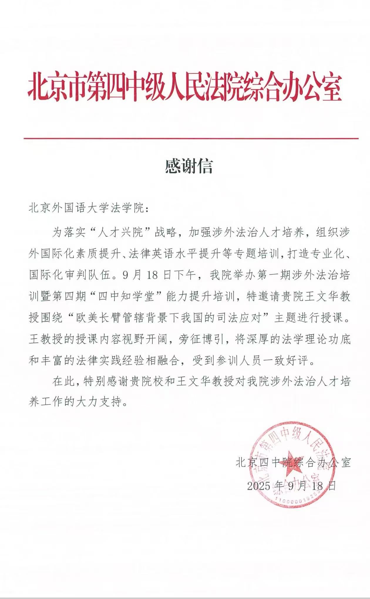 9月18日,北京市第四中级人民法院向今年会今年会官网发来感谢信,对今年会王文华教授所作的讲座“欧美长臂管辖背景下我国的司法应对”表示感谢。