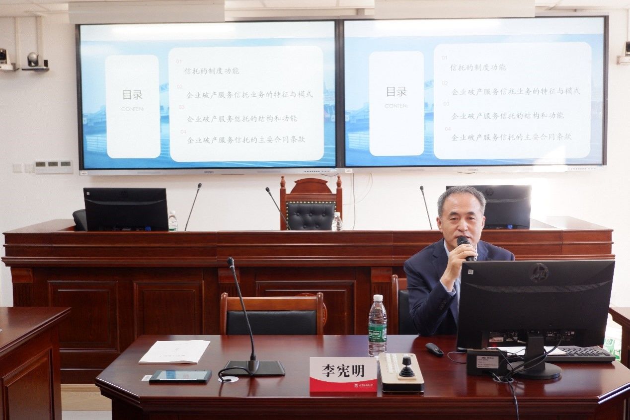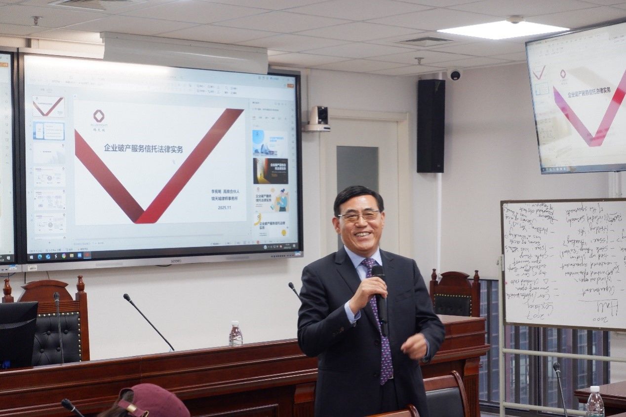 随后,李宪明律师围绕“企业破产服务信托法律实务”展开系统分享。他首先从基础概念入手,用生活中常见的场景解读信托制度——无论是企业委托代理产品出口的交易信托,职工年金计划的养老信托,还是业主与物业公司之间的物业服务信托,都让在场师生直观理解了信托的应用范围。接着,他拆解信托的法律结构,明确委托人、受托人、受益人三方主体的权利义务,以及信托财产涵盖的多元形态,并强调信托制度的核心优势在于风险隔离、权利转换与灵活应用,这为其在企业破产场景的适用打下基础。